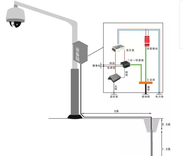 根据对监控系统的结构分析,以及雷电可能的侵入途径, 现对监控系统设计作以下防雷解决方案。