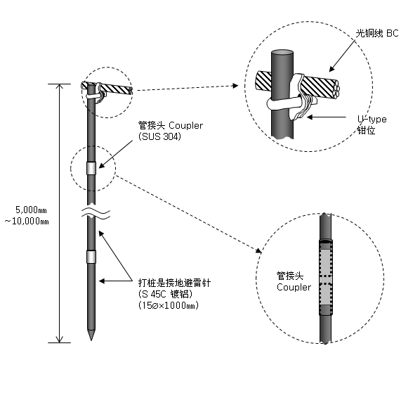 为了得到合适的普通接地电阻值,埋入多个接地铜避雷针并列连接,在市区或者限定区域里进行接地施工时, 能得到广阔的接地场所。
