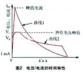 图2 是在双踪示波器上观察到的TVS 管在承受大电流冲击时的电流及电压波形。图中,曲线1 是TVS 管中的电流波形,可以看出:其流过TVS 管的电流由1mA 突然上升到峰值后,然后按指数规律下降。曲线2 是TVS 管两端的电压波形,它表示TVS 中的电流突然上升时,TVS 两端电压也随之上升。在浪涌电压的作用下,TVS 两极间的电压由额定反向关断电压VRWM 上升到击穿电压VB 而被击穿。随着击穿电流的出现,流过TVS 的电流将达到峰值脉冲电流IPP,同时其两端的电压被箝位到预定的最大箝位电压VC 以下。其后,随着脉冲电流按指数衰减,该过程中,TVS 两极间的电压也不断下降,最后恢复到初态,这就是TVS 抑制可能出现的浪涌脉冲功率,保护电子元器件的过程。事实上,当TVS 两极受到反向高能量冲击时,它能以10-12s 级的速度,将其两极间的阻抗由高变低,以吸收高达数千瓦的浪涌功率,使两极间的电位箝位于预定值,从而有效地保护电子设备中的元器件免受ESD 的损害。