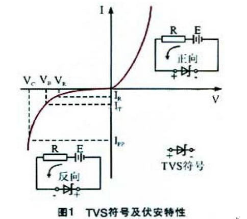 TVS是普遍使用的一种新型高效电路保护器件,它具有极快的响应时间(亚纳秒级)和相当高的浪涌吸收能力。当它的两端经受瞬间的高能量冲击时,TVS能以极高的速度把两端间的阻抗值由高阻抗变为低阻抗,以吸收一个瞬间大电流,从而把它的两端电压箝制在一个预定的数值上,从而保护后面的电路元件不受瞬态高压尖峰脉冲的冲击。正因为如此,TVS 可用于保护设备或电路免受静电、电感性负载切换时产生的瞬变电压[4],以及感应雷所产生的过电压。图1所示为TVS 的符号及伏安特性曲线。