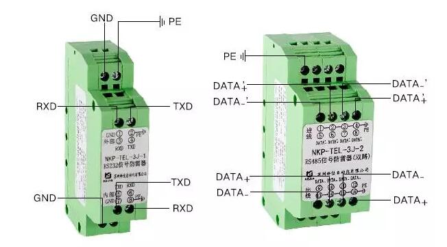 数字信号防雷器用于RS232、RS485、RS422等数字通信端口的防雷,采用标准插口和端子接线形式,可串接在通信设备输入端,防雷器的外部信号端接输入线,输出端接保护设备,PE端应于大地引线可靠连接。