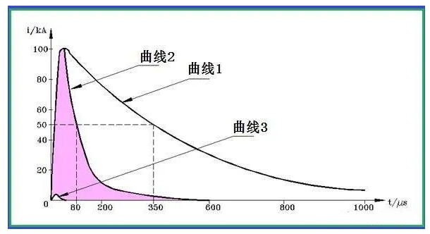 曲线1被称为冲击电流Iimp,其波头时间为10μS而半峰时间为350μS 。由于曲线1很接近自然雷电放电的电流波形,常用于一级配电。曲线3用于二级和三级配电的电气电子系统。