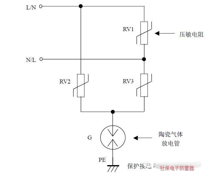 缺点:压敏电阻RV1短路失效后易引起火灾。最好在每个压敏电阻上串联一个工频保险丝以防压敏电阻短路起火。如果L、N线不可能接反,则可省去压敏电阻RV2、RV3,将放电管G的上端直接接到N线上,构成“1+1”电路。